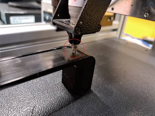 Nach dem Vorbereiten der Daten für das automatische Dispensen, ist an der Martin Rework Station/Dot Liner die Lötpaste anzubringen. Dabei ist darauf zu achten, dass er Düsenaufsatz in einem Winkel von 45° anzubringen ist (siehe Symbolbild). Die Granularität der Paste sollte 10um aufweisen (Type 6).